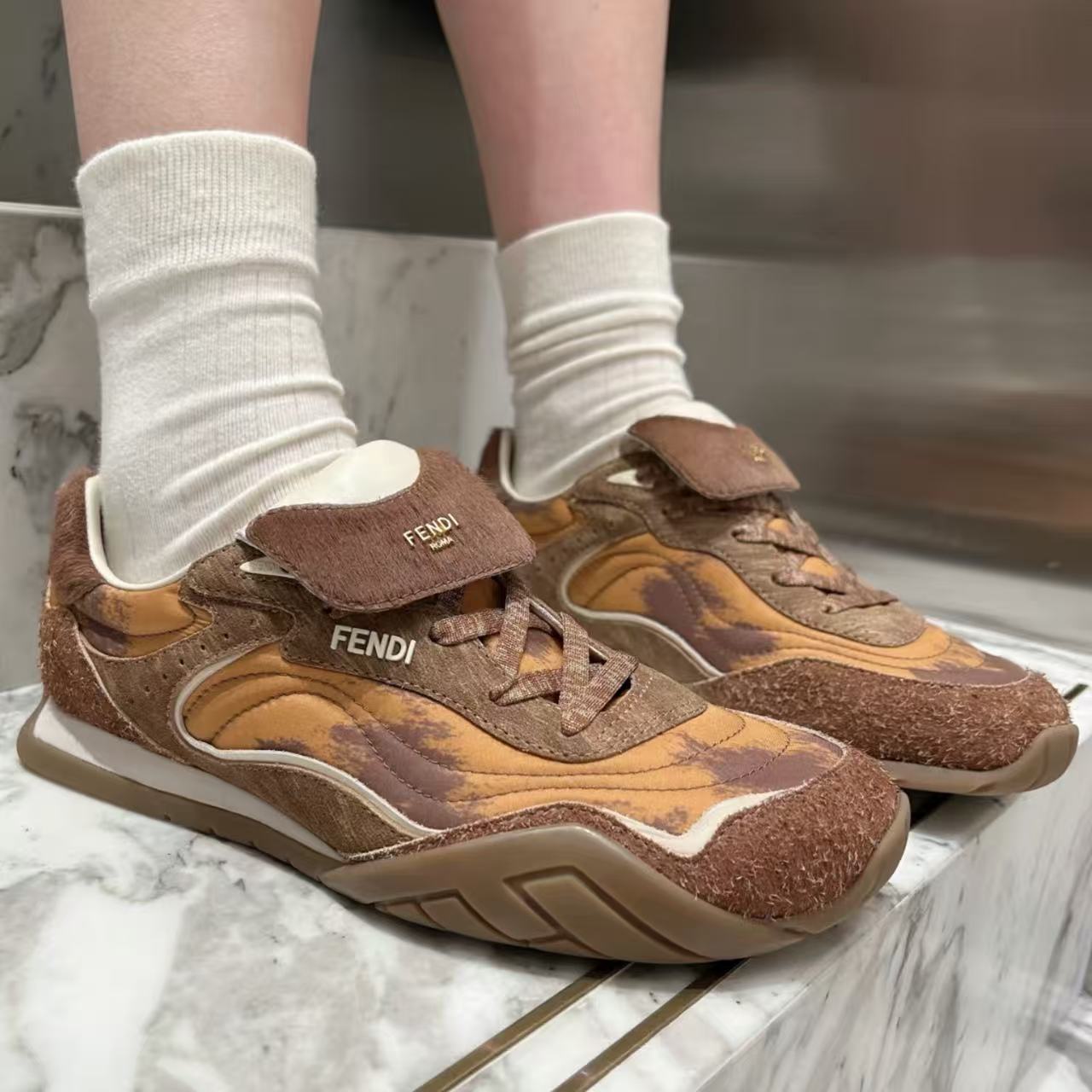 复古翻盖设计运动鞋,装点金色 Fendi 标志,结合泼墨花纹与立体马毛材质,兼具时尚感与实穿性。美国官网原价 950 美元,使用新人优惠码后可享折上 9 折,最终到手价仅需 612 美元。